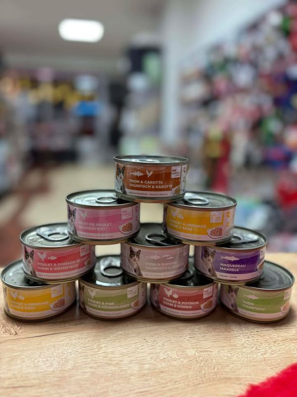 | saveur | Thon et carotte, Filet de poulet, Poulet et fromage, Poulet et poisson blanc, Thon et sardine, Maquereau, Poulet et foie, Poulet et potiron, Thon, Poulet et crevettes, Saumon, Thon et mangue, Poisson de l'océan, Cuisse de poulet, Thon et crevettes, Thon et fromage, Thon et Rouget, Poulet et ananas |