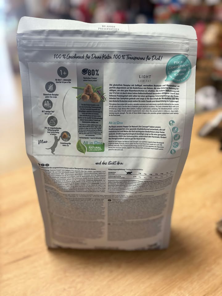 Lorsque le poids d’un chat ne dépasse pas le poids idéal de plus de 10%, les vétérinaires parlent d'un léger surpoids. Dans ce cas, Happy Cat Care Light est une bonne solution. Il convient également aux chats qui sont très paresseux et qui ont donc besoin d'un aliment à teneur énergétique réduite, ou si votre chat a déjà suivi un régime et que vous recherchez l'aliment de suivi approprié pour un maintien de poids de forme.
