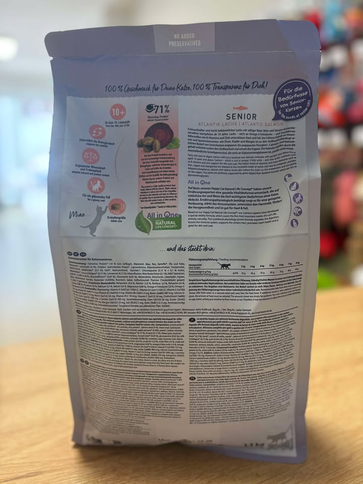 Du saumon savoureux et digeste, associé à de la betterave rouge juteuse et de la coriandre fine, constitue la base de ces croquettes pour chats âgés. Spécialement adaptée aux besoins chats de 10 ans et plus, la teneure vitamines et en oligo-éléments tels que le fer, le cuivre et le manganèse est plus élevée que dans les aliments secs pour adultes. Les chats âgés ont un besoin accru de ces éléments en raison de leur métabolisme. De plus, la teneur en phosphore, en calcium et en sodium a été adaptée afin de soulager le métabolisme et de ménager les organes de votre chat âgé. Le processus de vieillissement chez les chats peut entraîner des limitations fonctionnelles des organes, qui peuvent par exemple restreindre la fonction rénale. Il est donc important de soulager les organes avec une alimentation adaptée et des minéraux en quantité suffisante.