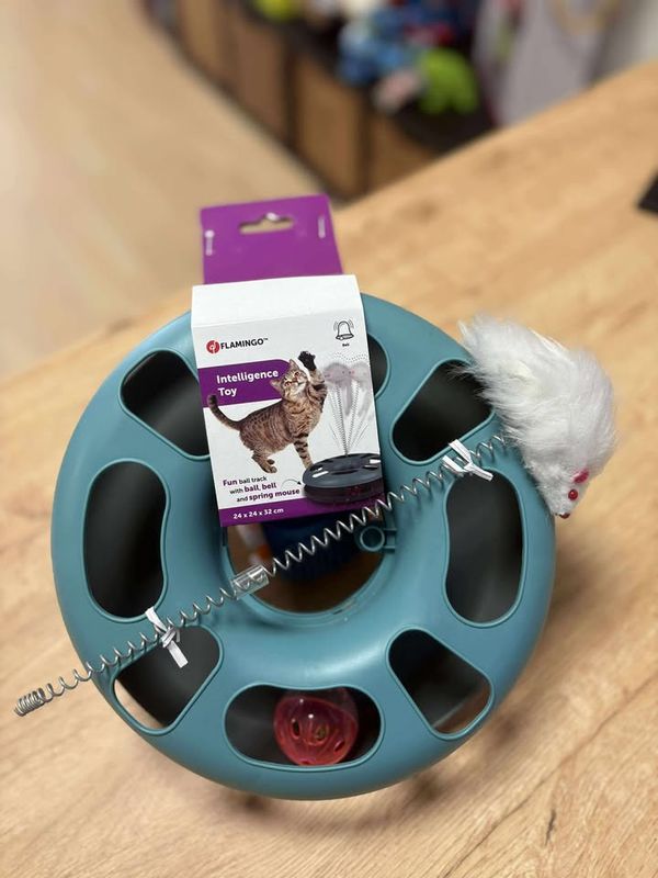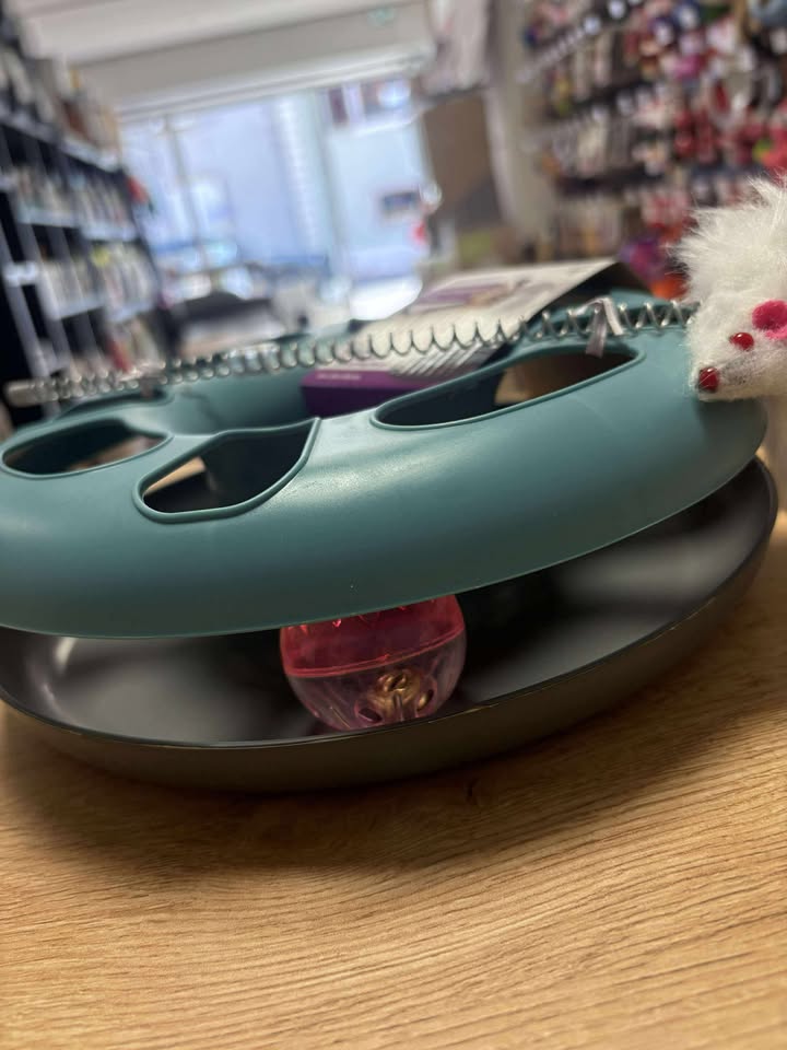 Offrez à votre félin un moment de jeu captivant avec le JOUET CIRCUIT AVEC BALLE. Ce jouet ingénieux combine un cercle à double paroi, une balle sonore et une plume accompagnée d'une souris de jeu pour stimuler les instincts naturels de chasse de votre chat.