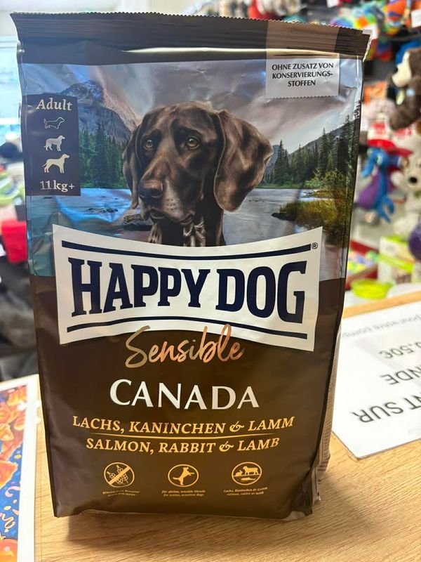 Il est particulièrement adapté pour les chiens de moyennes et grandes races à la sensibilité nutritionnelle particulière et aux besoins énergétiques spécifiques : En effet Happy Dog Canada est un mélange unique de Saumon de viande de Lapin et d'Agneau.