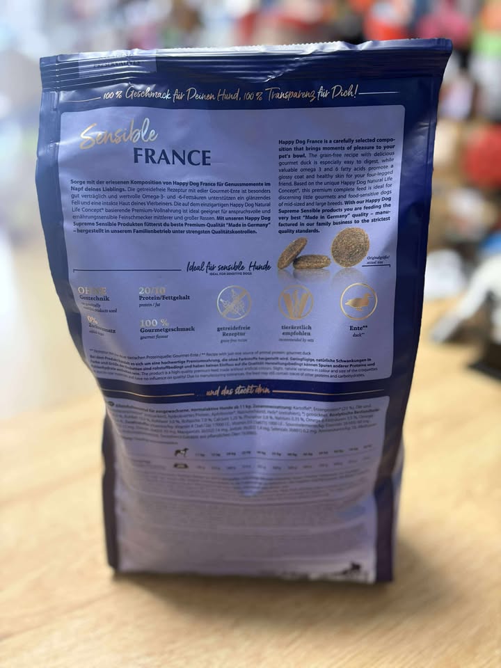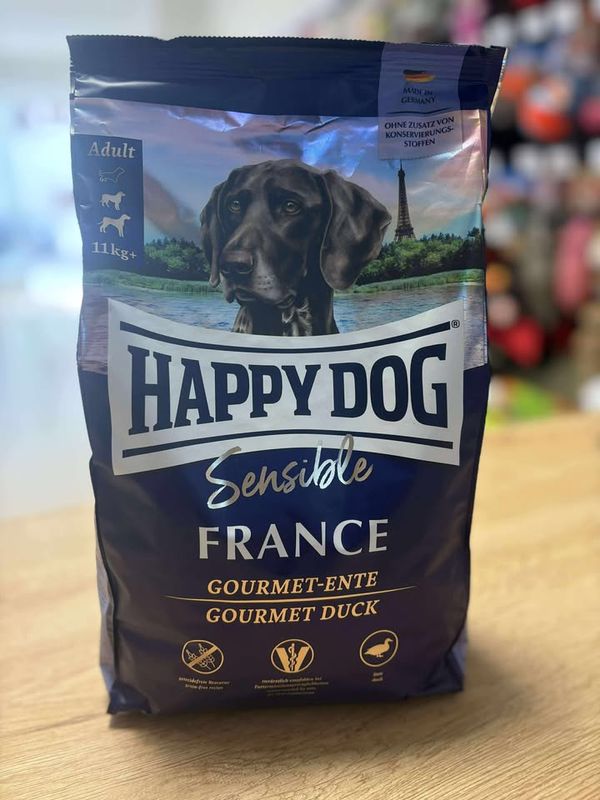 Happy Dog FRANCE repose sur une composition équilibrée de canard fermier et de pommes de terre fines. Cette recette est idéale pour les gourmets et les chiens hypersensibles. Grâce à sa formule mono-protéinée, elle est également idéale pour les chiens présentant des intolérances alimentaires. La recette sans céréales est facile à digérer et enrichie en huile de tournesol et de colza. Avec cela, vous fournissez à votre ami à quatre pattes bien-aimé tout ce dont il a besoin pour une alimentation saine.