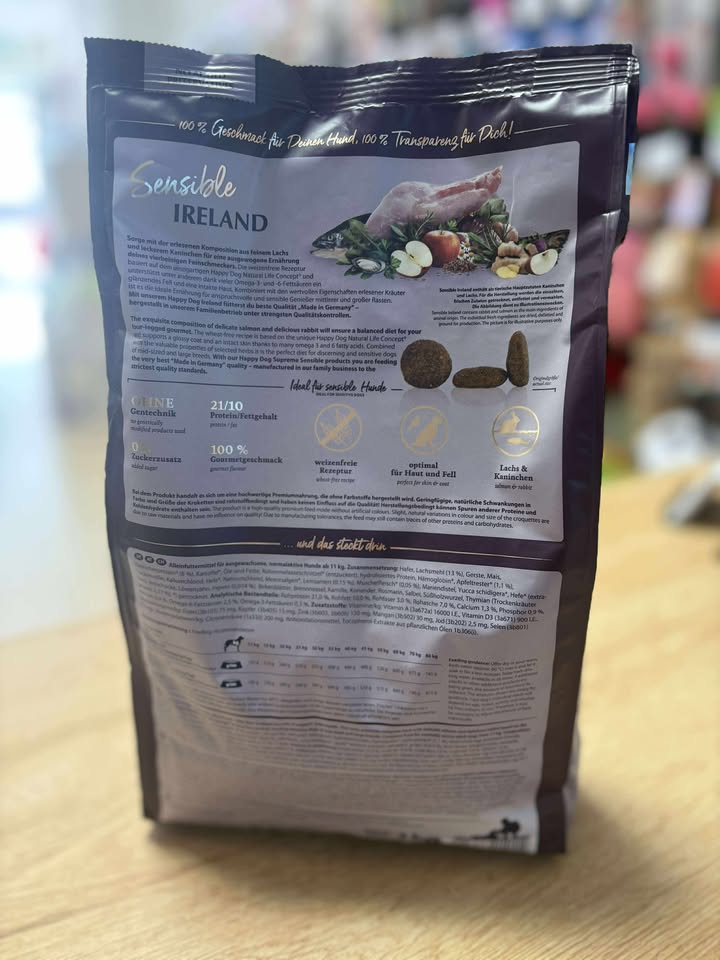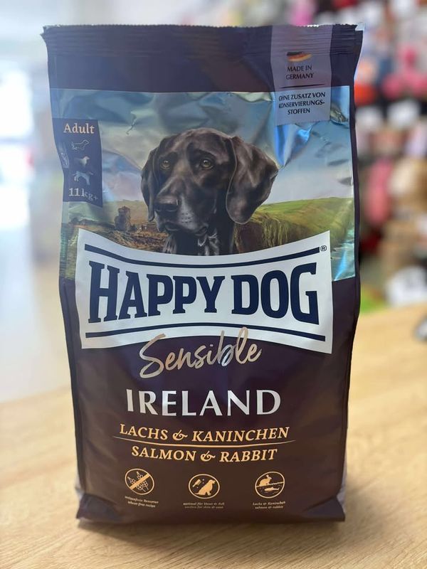 A tous les gourmets friands de saveurs nouvelles, très sensibles ou très difficiles, Happy Dog propose un plat vraiment extraordinaire : l'aliment complet Super Premium Ireland extrêmement savoureux, est élaboré à base de saumon fin et de lapin délicieux.