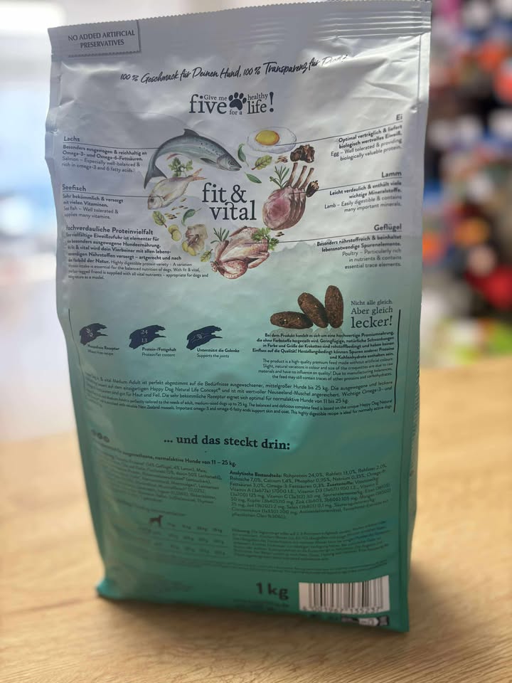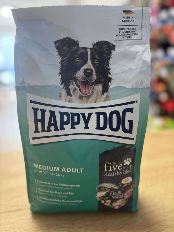 Un apport excessif en protéines et en graisse est souvent à l'origine de maladies chroniques dont souffrent nos chiens, surtout s'ils manquent d'exercice. Happy Dog Fit & Vital Adult Medium y remédie en proposant une alimentation équilibrée et pas trop riche, répondant aux besoins réels d'un chien normalement actif.