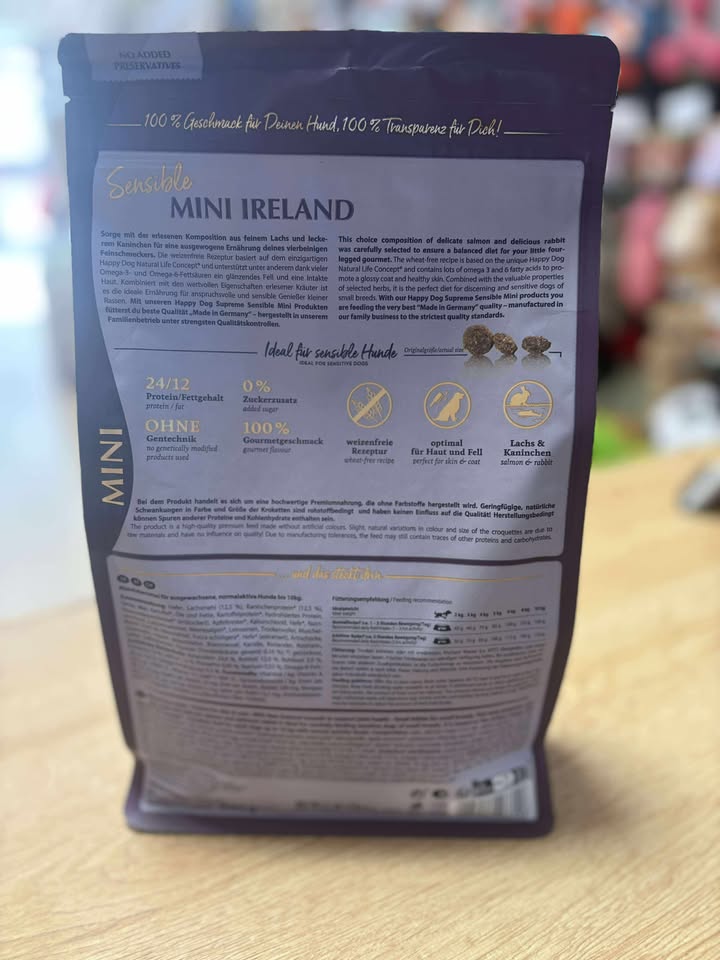 Faites plaisir à votre chien avec une recette raffinée à base de saumon nourrissant, délicieux lapin et de précieuses céréales. Le saumon est naturellement riche en acides gras essentiels oméga-3 et oméga-6, tandis que le lapin apporte des protéines de haute valeur biologique et d'autres nutriments essentiels. Les céréales complètes apportent à votre petit chien des fibres alimentaires importantes pour une bonne digestion. Basé sur le concept unique Happy Dog Natural Life Concept, les moules de Nouvelle-Zélande soutiennent les articulations et les précieux acides gras oméga-3 et oméga-6 assurent la brillance du poil et une peau saine. Les petites croquettes particulièrement savoureuses Happy Dog Sensible Mini Ireland sont idéales pour les chiens adultes de petite taille jusqu'à 10 kg, car la taille des croquettes est spécialement adaptée à la taille de leur mâchoire.