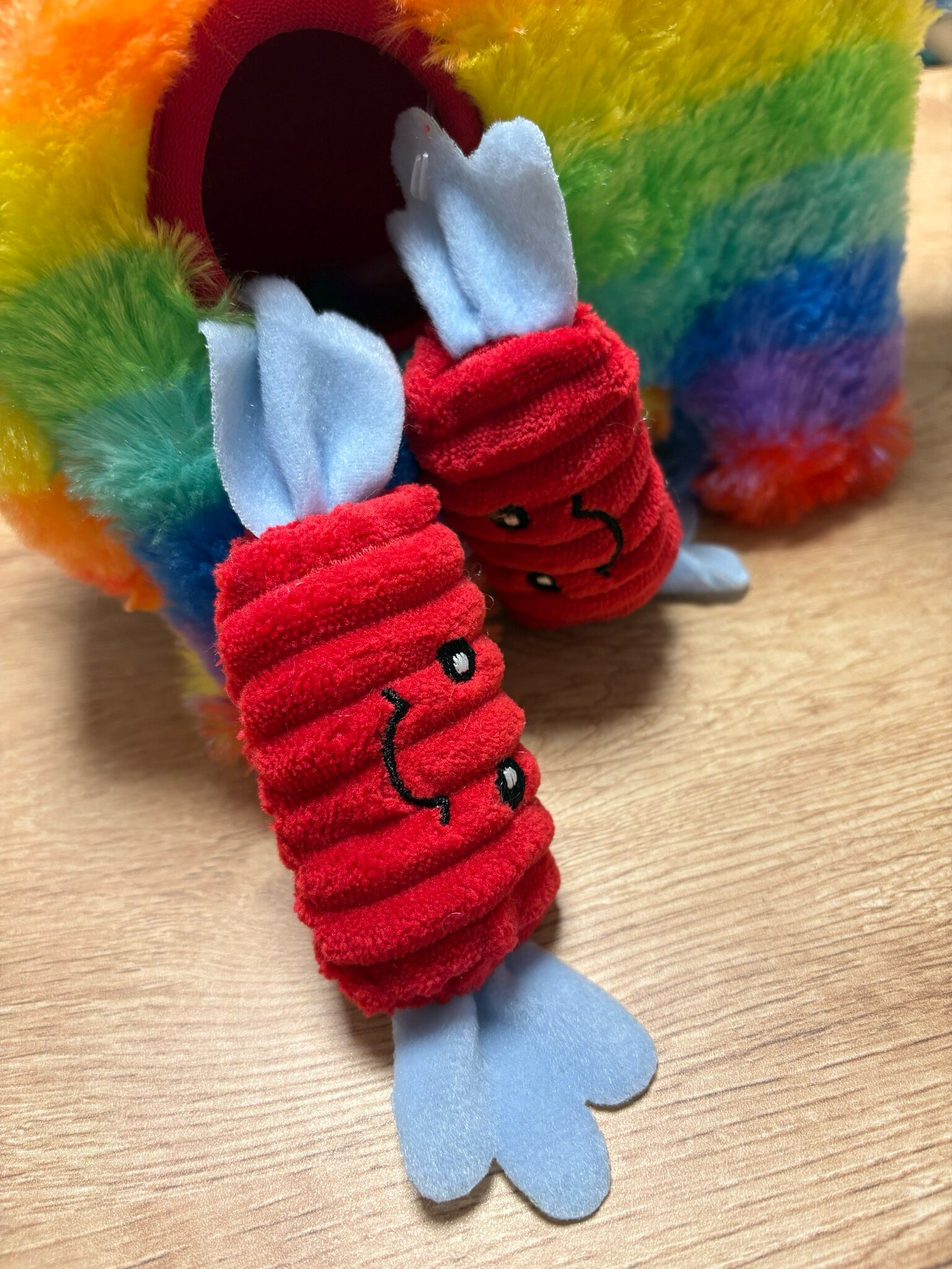 - Design irrésistible : Forme d’animal adorable avec un pelage multicolore en peluche douce.