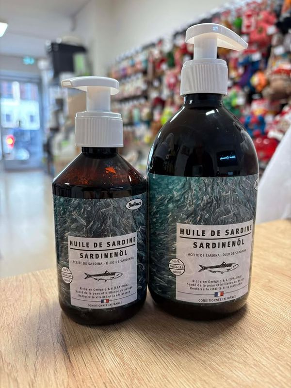 L'huile de sardine constitue un complément alimentaire essentiel qui contribue à la santé et le bien être de votre animal.