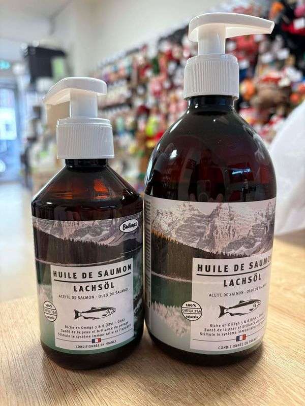 L'huile de saumon constitue un complément alimentaire essentiel qui contribue à la santé et le bien être de votre animal.