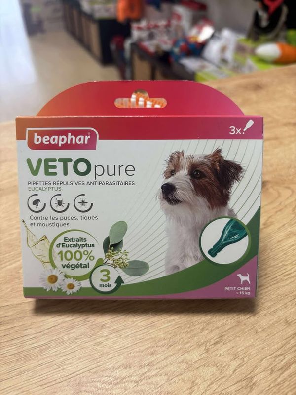 La gamme VETOpure de Beaphar est efficace contre les puces, les tiques et les moustiques. Les pipettes VETOpure pour petit chien ont été spécialement conçues pour repousser les parasites externes. Elles contiennent de I'huile d'Eucalyptus et des extraits de Chrysanthemum cinerariaefolium (fleurs de Pyrèthre de Dalmatie), arbre et plante reconnus pour leurs propriétés répulsives contre les insectes. En cas d'infestations massives, il est conseillé de traiter l'environnement de l'animal et I'habitat avec un insecticide de la gamme VETOpure de Beaphar, comme le spray, le pulvérisateur et les diffuseurs automatiques insecticides habitation.